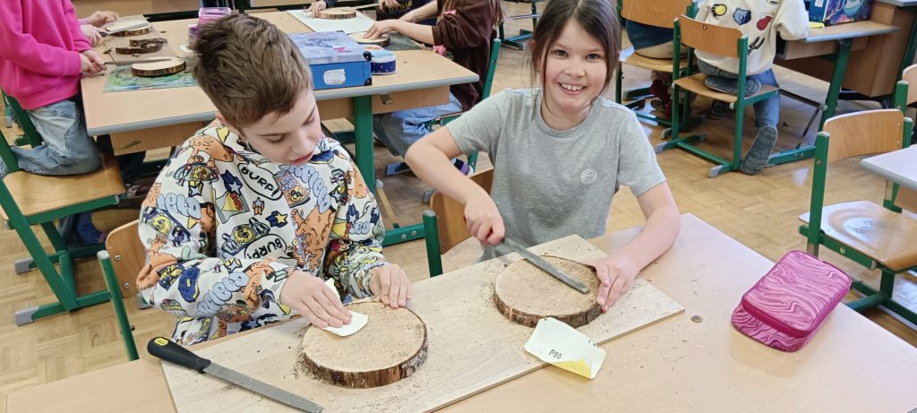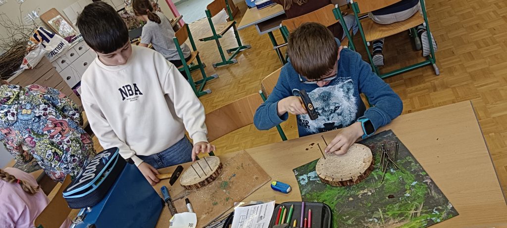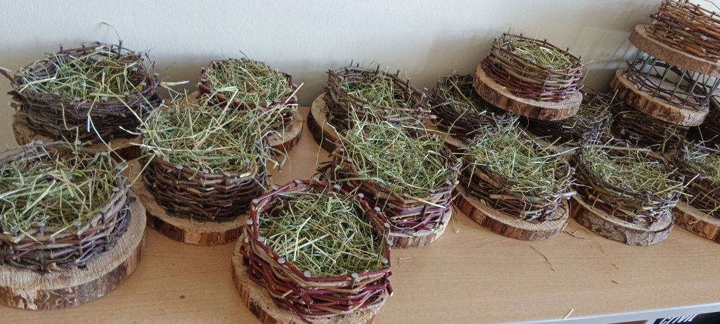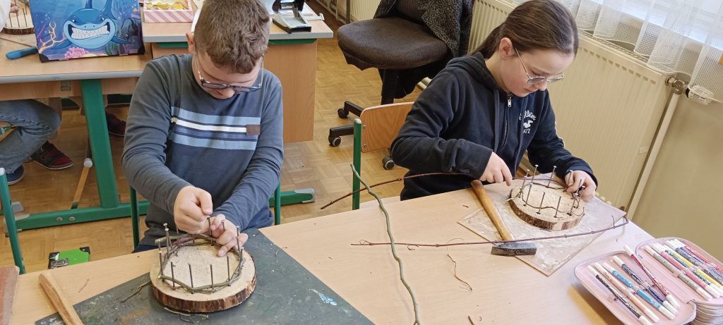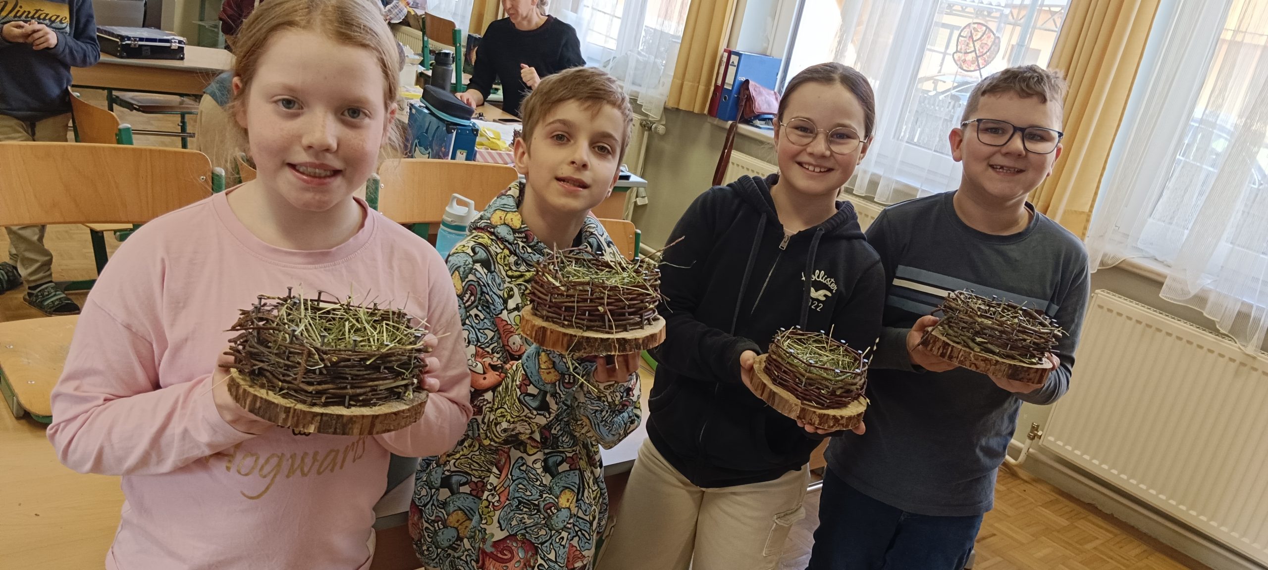 13.3. 4b Osternester / Berichte/Aktuelles / Von vskrieglach Ostern ist nicht mehr fern und so wurden im Werkunterricht von den Kindern der 4b Klasse auf Holzscheiben Osterkörbchen mit Ästen geflochten und danach ausgelegt.