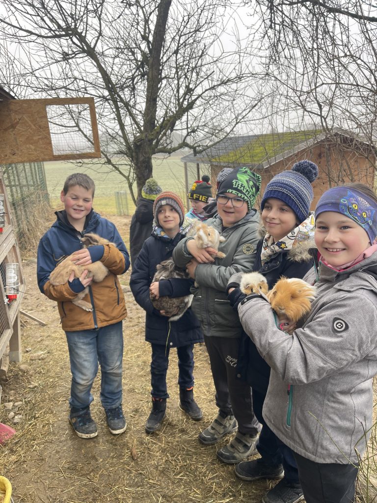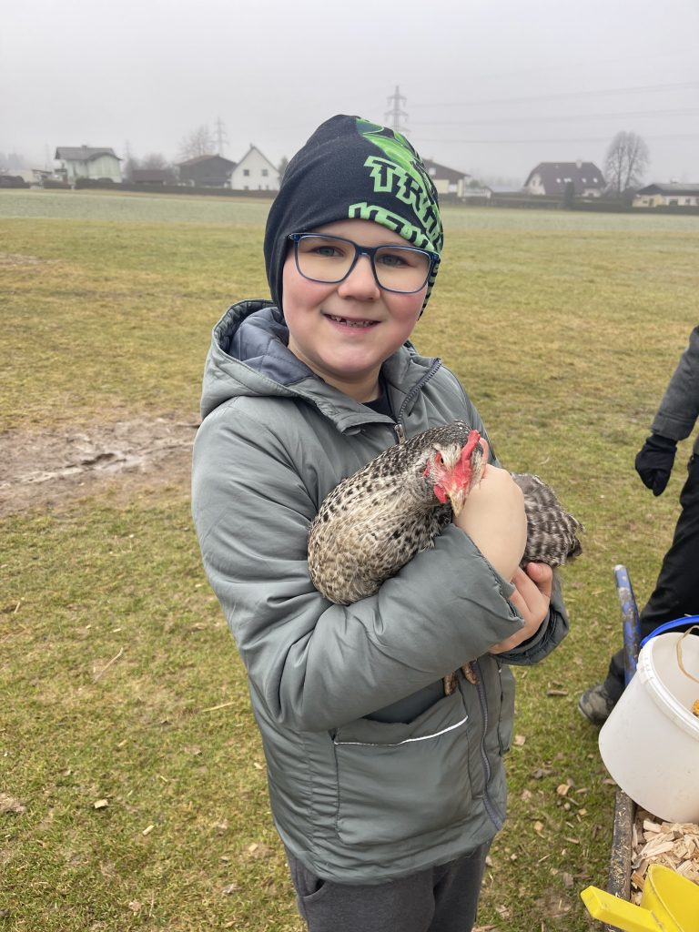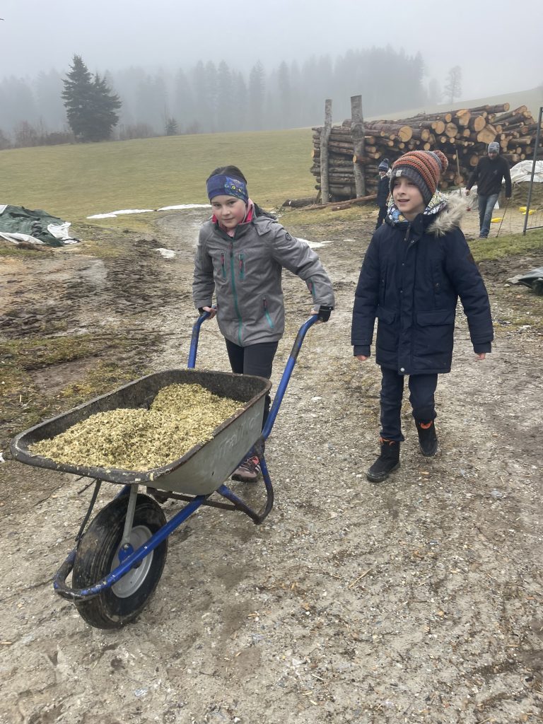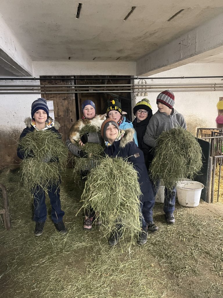 Im Rahmen der Outdoorschule besuchten am Freitag die Kinder der 4b Klasse den Bauernhof der Familie Ebner. Zum Abschluss des Projekts erlebten die Kinder die Hofarbeit, durften auch helfen, konnten einige Tiere streicheln und wurden auch noch kulinarisch versorgt.