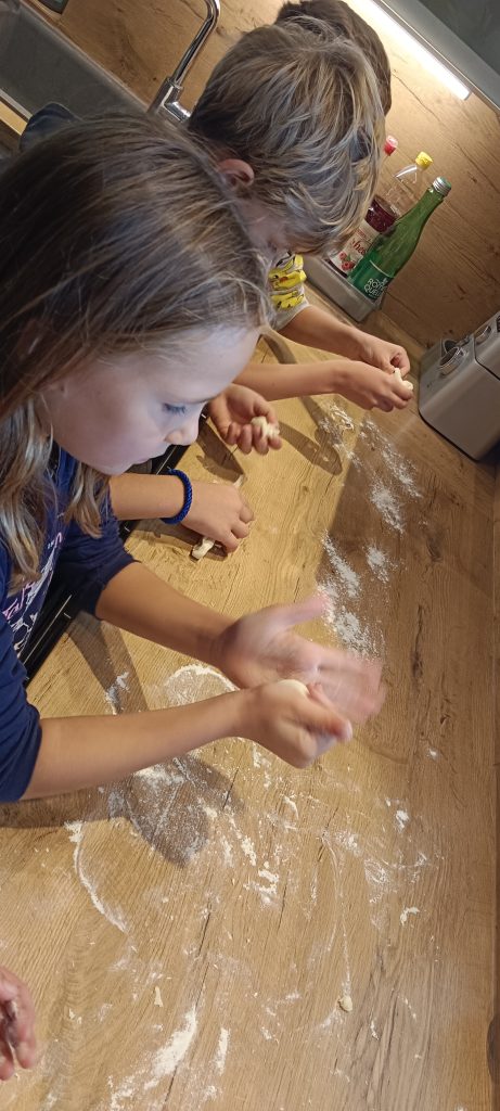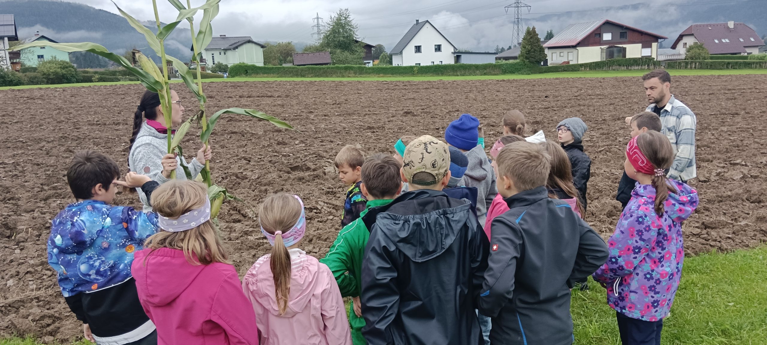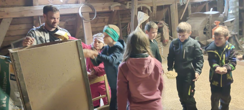 Am Freitag – im Rahmen der Draußenschule, gingen wir zum Ebnerhof, wo wir uns mit den heimischen Getreidesorten beschäftigten. An vielen Stationen wurde uns der Weg des Getreides bis zum Brot nahe gebracht. So droschen wir Körner aus den Ähren, mahlten Mehl und backten köstliche Weckerl.