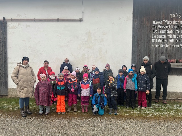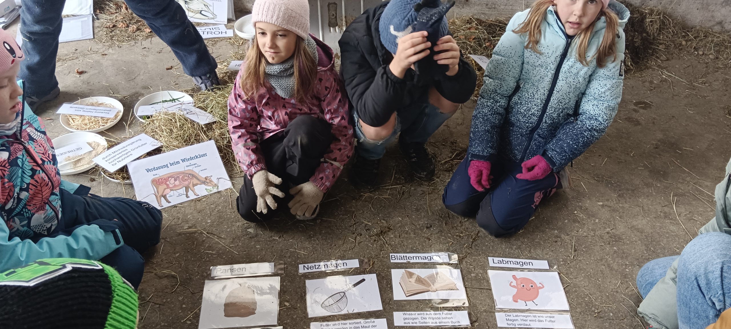 Im Rahmen der Draußenschule verbrachten die Kinder der 4b Klasse einen Vormittag am Bauernhof. Dort erfuhren Sie wichtige Dinge über Rinder, die verschiedenen Mägen, die Milchproduktion, die Pflege und Aufzucht, aber auch vom Almauf- und Abtrieb mit speziellem Tierschmuck wurde einiges gelernt.