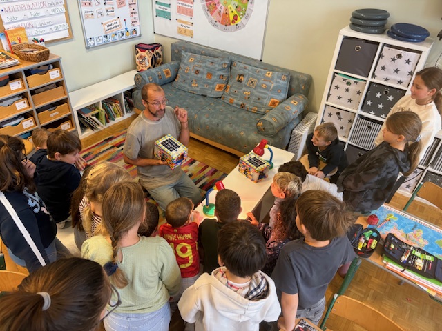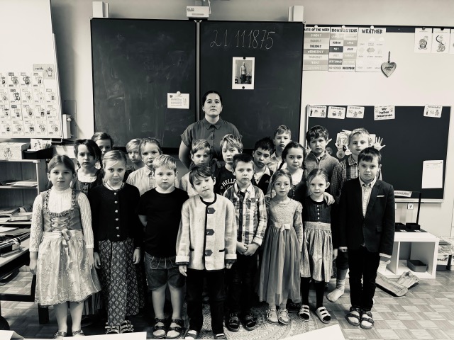 Die Kinder der Familienklassen befassten sich im Sachunterricht mit dem Thema „Schule früher“. Am Beispiel von 1875 wurde erklärt, welches Gewand damals von Schüler:innen und Lehrer:innen getragen wurde und wie streng der Unterricht damals abgehalten wurde. Sogar das Scheitelknien konnte ausprobiert werden.