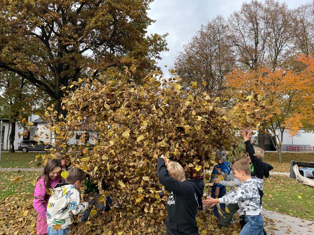 Der Herbst liefert im Rosegger Park viele Blätter, die zur Bewegung einladen. Daher wurde der Turnsaal kurzerhand nach draußen gelegt und die Kinder der 2a Klasse konnten mit dem Laub einen großen Haufen errichten und ihren Bewegungsdrang an der kühlen Herbstluft ausleben.