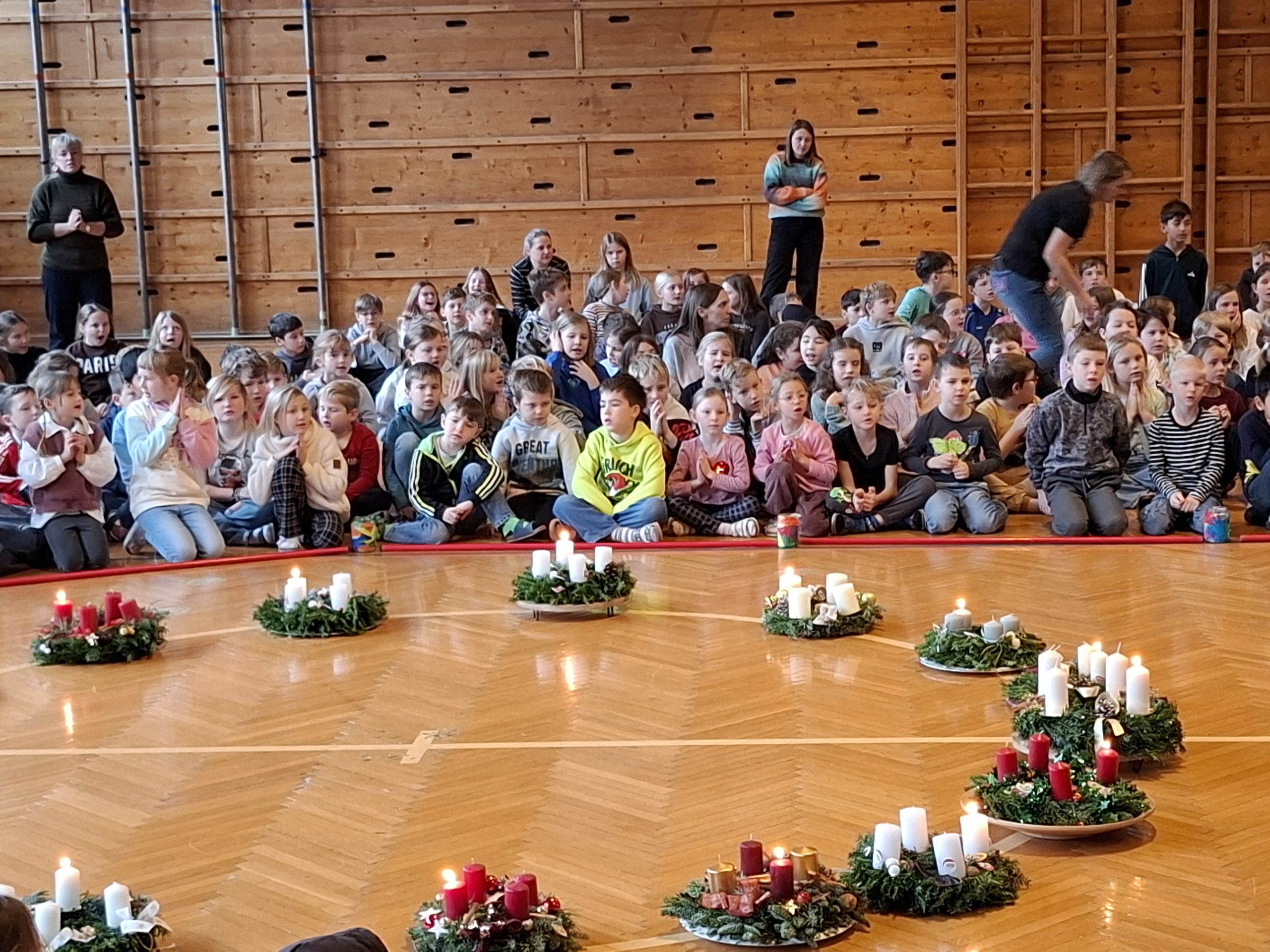 In einer gemeinsamen Feierstunde der Volksschule und Sonderschule im Turnsaal wurden die Adventkränze von unserem Herrn Pfarrer geweiht. Die Religionslehrerinnen gestalteten die Feier und einige Kinder lockerten diese mit musikalischen Beiträgen auf.